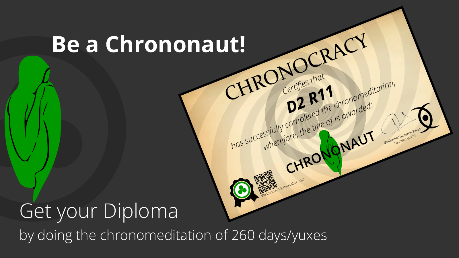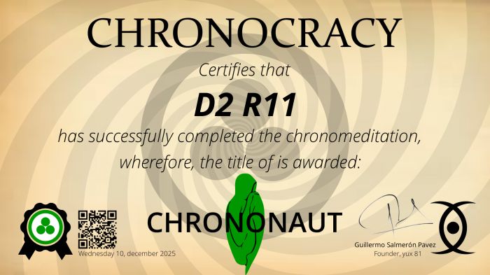 While the intention of chronocracy is to maintain this free platform, your minimum contribution of $260 USD —at $1 per day— is necessary for you to obtain the title of chrononaut by performing the chronomeditation, which will begin on the day: Thursday 27, august 2026 (you can do it without donating anything: 1) start on the designated date; 2) watch the tutorial video every day; 3) assimilate the knowledge, meditate on the day’s yux mandate, and experience it in your existence; 4) at the end of the chronomeditation you will have achieved the conscious state of the chrononaut, but we will not be able to certify that you completed it; 5) certification allows you to represent the chronocracy, participate in our meetings, and cooperate in the expansion of chronocratic knowledge).
